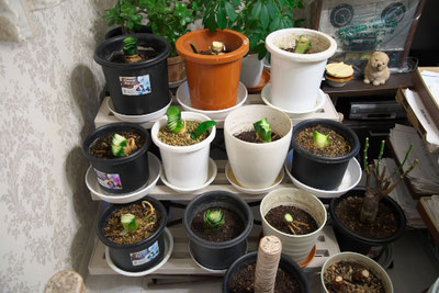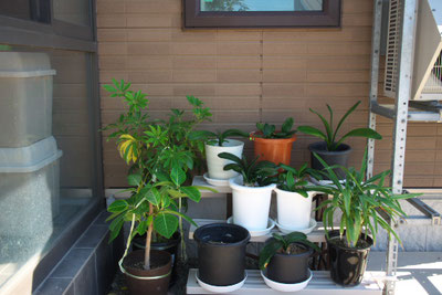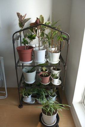 しまっておいたビニール温室を組み立てました。 ゴムの木が伸びてビニールは掛けられません。 再下段はシャコバサボテンが5個。 手前は伸びだしたオリヅルラン。