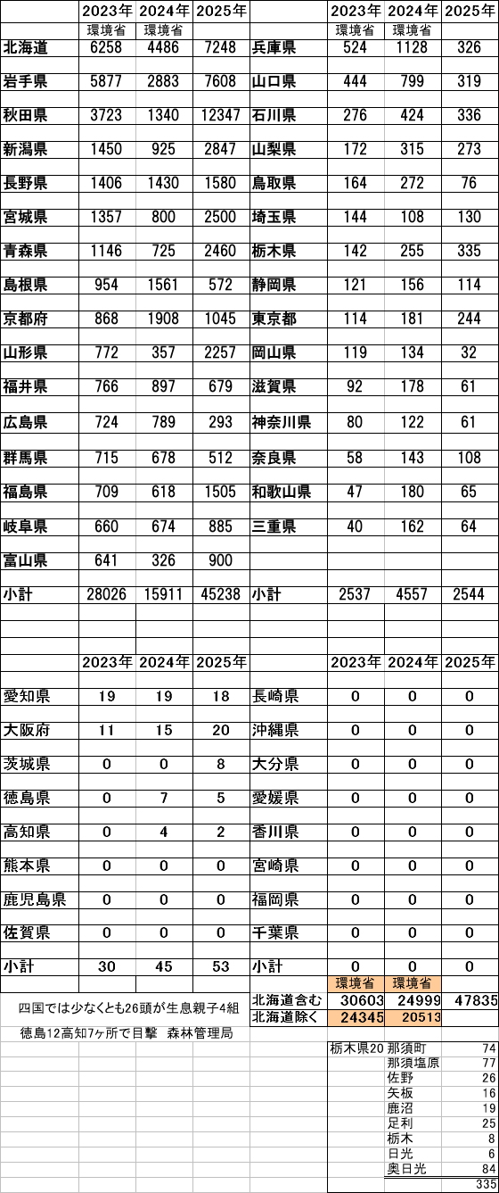 四国では少なくとも26頭、4組の親子が確認されています。 放っておくと、狭いエリアですから秋田県の様にも成り兼ねません。 四国の方は、ご用心を。 情報は林野庁森林管理局発表。 確認は高知と徳島ですが、香川と愛媛は調査されていないようです。 四国4県にも生息していると考えるのが、普通だと思われます。