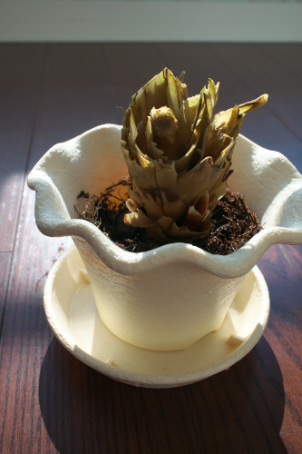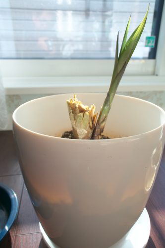 | 葉が無残の状態の子株。 | どうにもならないので、葉を取りました・・・。 | |
