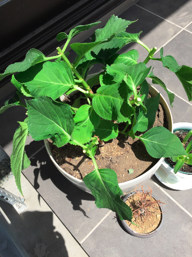| 5月5日 一か月後。 大きな鉢に植え替えてます。 | 5月28日 紫陽花の花は完全に終わりました。 落ちることはないので、剪定しなければなりません。 |