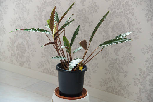 | カラティアの葉先が枯れてきたので、バッサリと剪定しました。 気が付くと何やら黄色いものが。 花でした。 小さなカラティアに花が咲いたことがありますが、比較的大きなカラティアの花は今回が初めてです。 カラティアは育てるのが難しいです。 日光浴は葉が焼けますし、日にあてないのも良くありません。 水分が足りなくても葉先が 枯れますので、比較的多めに水は与えています。 カラティアは、就眠運動をする植物です。 |