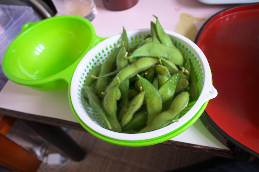 | 枝豆も・・・(^^♪。 | 今日は、丸ごと持ってきてくれました。 とりたてなので、洗面所で洗います・・・(^^♪。 |