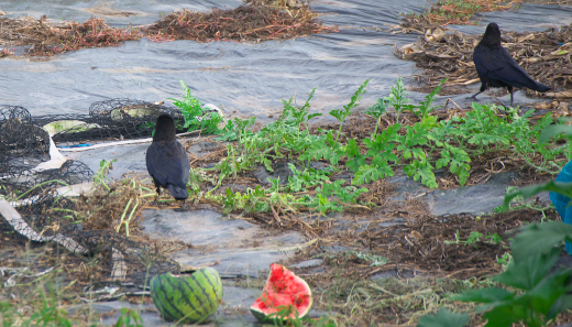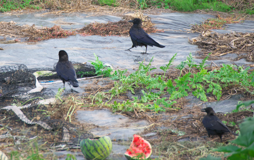 ムムム、見慣れない大きなカラスが畑に・・・(-_-;)。