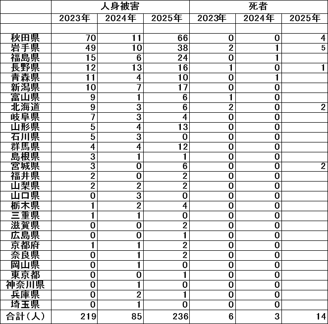 | ※記事は報道発表時(確認時)の日付です。 12月20日宮城県大和町で、猟友会男性がクマに襲われ死亡。檻に掛かったクマは駆除。6 12月4日富山県富山市で、新聞配達していた夫婦がクマに襲われ負傷。5・6 12月4日長野県野沢温泉村で、除雪作業をしていた男性がクマに顔と足襲われ負傷。16 12月4日島根県益田市で、男性が自宅を出た所でクマに襲われ顔とうでを負傷。1 12月4日岩手県奥州市で、飼い犬を探していた女性がクマに襲われ顔と腕を負傷。38 11月28日群馬県沼田市で、沼田駅前の公衆トイレで男性がクマに襲われ負傷しました。12 11月25日新潟県胎内市で、捜索中の警察ヘリが損傷の激しい男性の遺体を発見。近くでクマを目撃。クマに襲われた 可能性も。 11月23日栃木県鹿沼市で、男性が庭先でクマに顔と上半身襲われ負傷しました。4 11月22日宮城県栗原市で、病院の駐車場で男性がクマに襲われ顔と右腕を負傷。5 11月20日福井県大野市で、倉庫の裏手で作業中の男性がクマに背後から襲われ頭を引っ掻かれ負傷。2 11月20日山形県尾花沢市で、自宅の畑に向かった女性が柿の木から降りてきたクマに顔や 腕を襲われ重傷。13 11月16日秋田県鹿角市花輪で、女性が田んぼで倒れて死亡。噛みつきあとやひっかき傷。 身元と死因を調査。11月18日死因は低体温症と判明。 11月16日福島県磐梯町で、電気柵の撤去中にクマに襲われ頭などを負傷。23 11月15日群馬県藤岡市で、イノシシ狩猟中の男性がクマに頭と腕を襲われ意識不明。その 後一命はとりとめた。 6人 でイノシシ狩猟。11 11月12日新潟県新発田市で、猟友会男性がクマに襲われ顔を噛まれる。新発田市からの要請でクマ出没の柿の木を 見回り襲われ怪我しつつもクマを駆除18 11月12日岩手県八幡平市で、犬の散歩をしていた男性がクマに襲われ頭を負傷。37 11月11日新潟県湯沢町で、ホテルの宿泊客が駐車場でクマに襲われ左腕を負傷。1711月11日山形県米沢市で、散歩中の男性がクマに襲われ顔と肩を負傷しました。12 11月10日秋田県鹿角市花輪で、男性がクマに襲われ顔などを負傷しました。6611月9日新潟県新発田市で、自宅の敷地内で男性がクマに襲われ脇腹を負傷しました。16 11月9日青森県三戸町で、ラーメン店の裏で仕込みをしていた男性がクマに襲われ顔を負傷 しました。10 11月9日秋田県美郷町で、男性が家の玄関を出た所でクマに襲われ顔や手を負傷。65 11月9日秋田県五城目町で、女性2人がクマに襲われ顔や太ももを負傷しました。63・64 11月8日秋田県仙北市田沢湖で、男性が農作業中にクマに襲われ負傷しました。62 11月8日新潟県湯沢町で、男性がクマに襲われ左腕を負傷しました。15 11月7日新潟県糸魚川市で、27日罠の確認中にクマに襲われ右腕骨折の重傷で入院。14 11月6日宮城県仙台市で、自転車の男性が飛び出したクマにぶつかり負傷しました。 11月6日秋田県大仙市で、男性が自宅敷地内で背後からクマに襲われ負傷しました。61 11月5日山形県新庄市で、クマから逃げようとした女性が転倒し負傷しました。11 11月4日秋田県秋田市下新城で、新聞配達員が住宅の敷地内でクマに右目付近と右手を襲われ負傷しました。60 11月3日青森県十和田市で、キノコ狩りの男性がクマに襲われ顔面を負傷しました。911月3日秋田県湯沢市で、2日から行方不明の女性を山中で損傷の激しい遺体で発見。 クマに襲われたとみて捜査。 11月3日秋田県大仙市で、散歩中の男性がクマに襲われ顔などを負傷しました。58 11月3日秋田県秋田市で、住宅の敷地内で男性が親子クマに襲われ負傷しました。57 11月2日京都府丹後市で、柿の木を警戒していた男性がクマに襲われ負傷しました。2 11月2日岩手県花巻市で、女性が自宅庭の落ち葉拾い中にクマに襲われ尻を負傷。36 11月2日福島県会津坂下町で、除草作業の男性がクマに襲われ頭・肩。足を負傷。22 11月1日福島県会津美里町で、ジョギングの男性が親子クマ2頭に襲われ負傷しました。21 11月1日岩手県大槌町で、猟友会の男性がクマ狩猟の為山に入ったところクマに襲われ顔を負傷しました。 11月1日山形県南陽市で、市の職員がパトロール中にクマに襲われ手を骨折の重傷。10 |