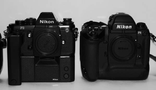 F4とF3。F4は重戦車のような感じ。F4のロゴは立派なのだが、ニコンが斜体でやや迫力に欠ける。F4は使って楽しいカメラである。F3はプロ用として初めてカスタマイズされたカメラで、用途は報道用つまり新聞社用として進化している。F3Pがそれだが、一般人には普通の物で充分であろう。MD-4を外せばコンパクトなカメラになり、何処にでも持って行かれる。 |