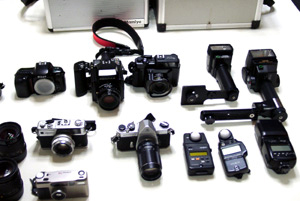 ニコンスピードライトSB-26と汎用ストロボ。 露出計が二台。 ペンタックス645も見えています。 ああ、コンタックスT-2もありました・・・。 |