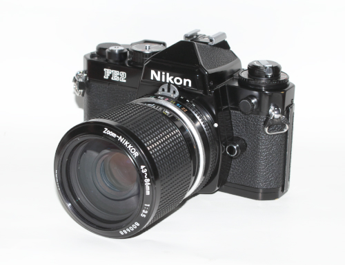 ニコンFE2に装着。 バランスは、このような直線で構成された 小型カメラにピッタリときます。 |